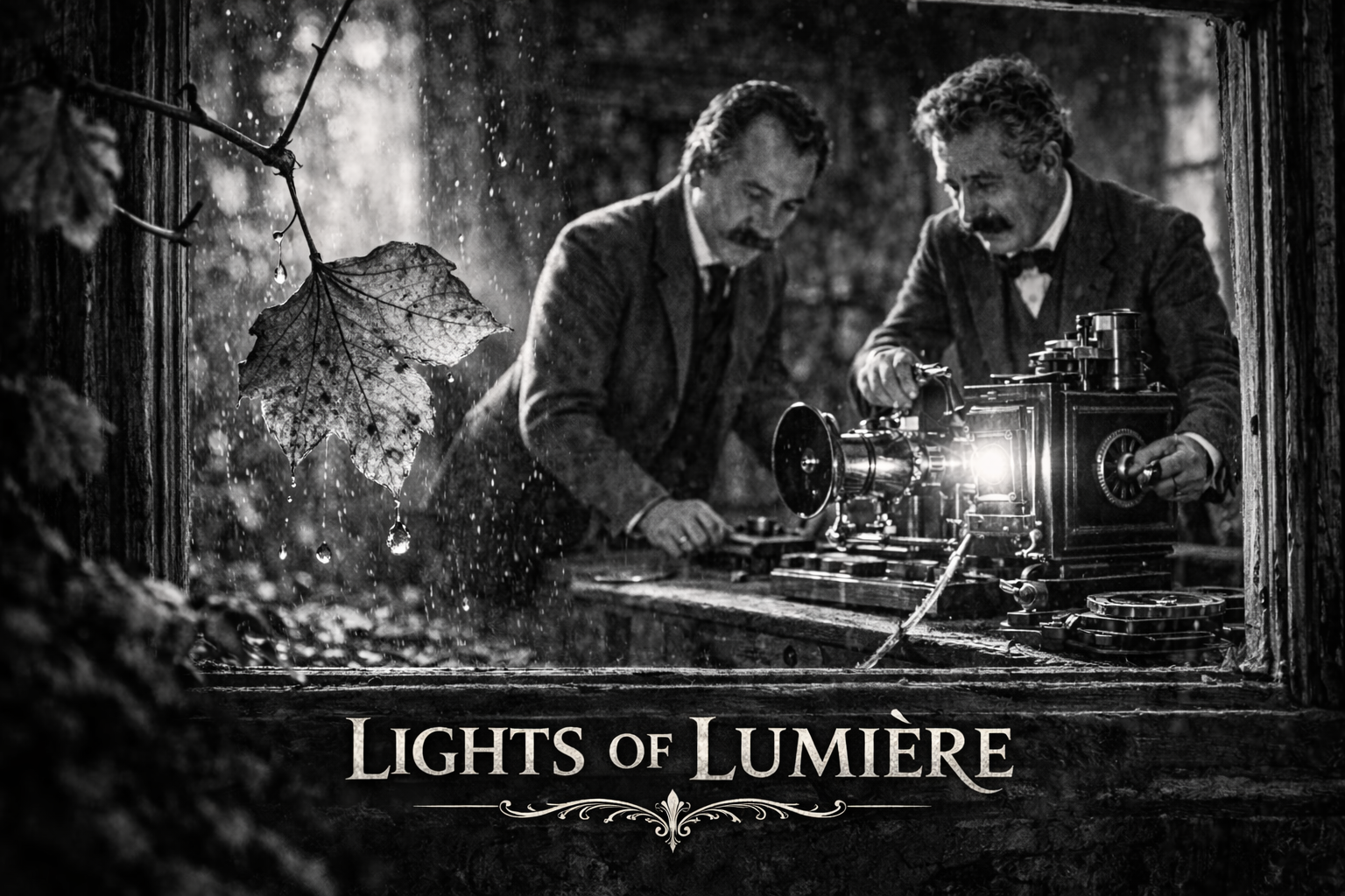 Curious, the brothers carried the cinematograph outside and aimed the camera toward the branches of the tree. Louis began turning the small hand crank, and the machine answered with its steady mechanical rhythm as the film advanced frame by frame. The rain continued to fall as the camera watched the tree in silence.